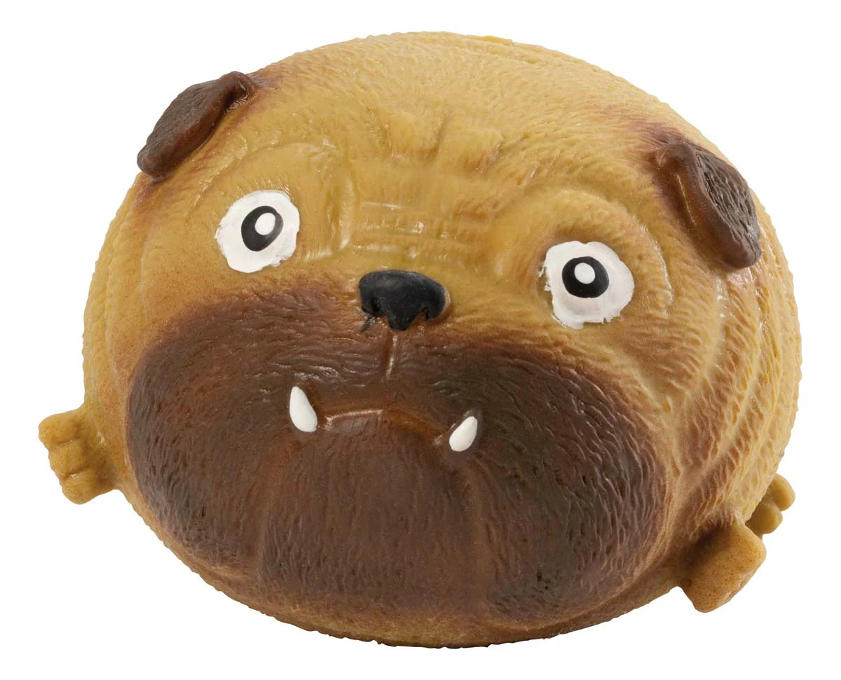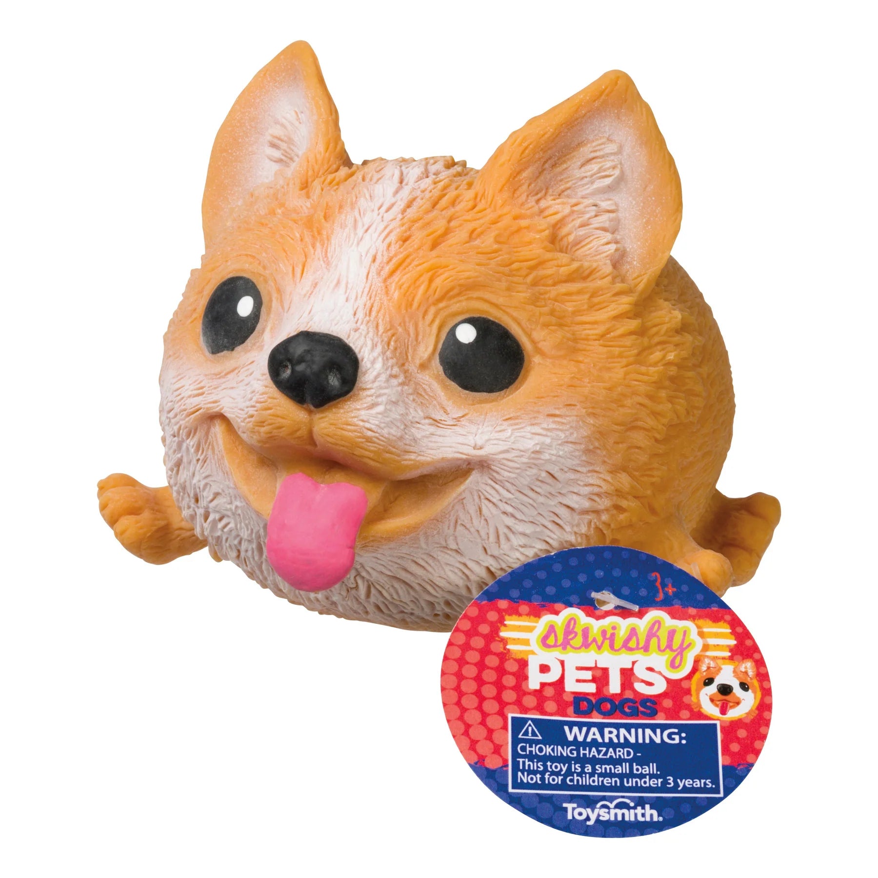Skwishy Pet Dogs that are 4.5 inches in diameter and have round spherical bodies. These squish balls come in 4 different brightly colored dog styles. Choose the brown Pug, beige and pink French Bulldog, orange and white Corgi, or the yellow Labrador Retriever.
